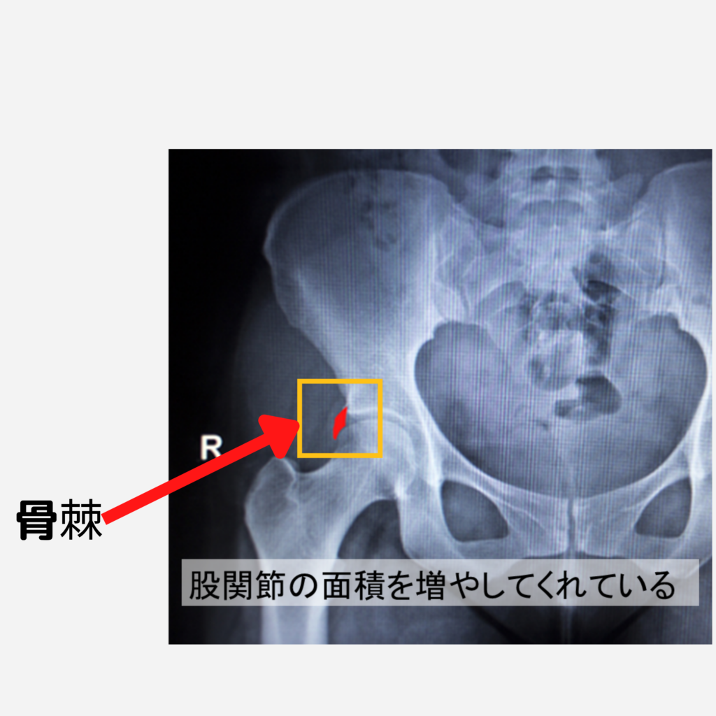 臼蓋形成不全では股関節が浅くなってしまい、股関節の安定性が低下してしまうのですが、骨棘によって関節の面積が増えて股関節の安定性が向上する可能性があります。