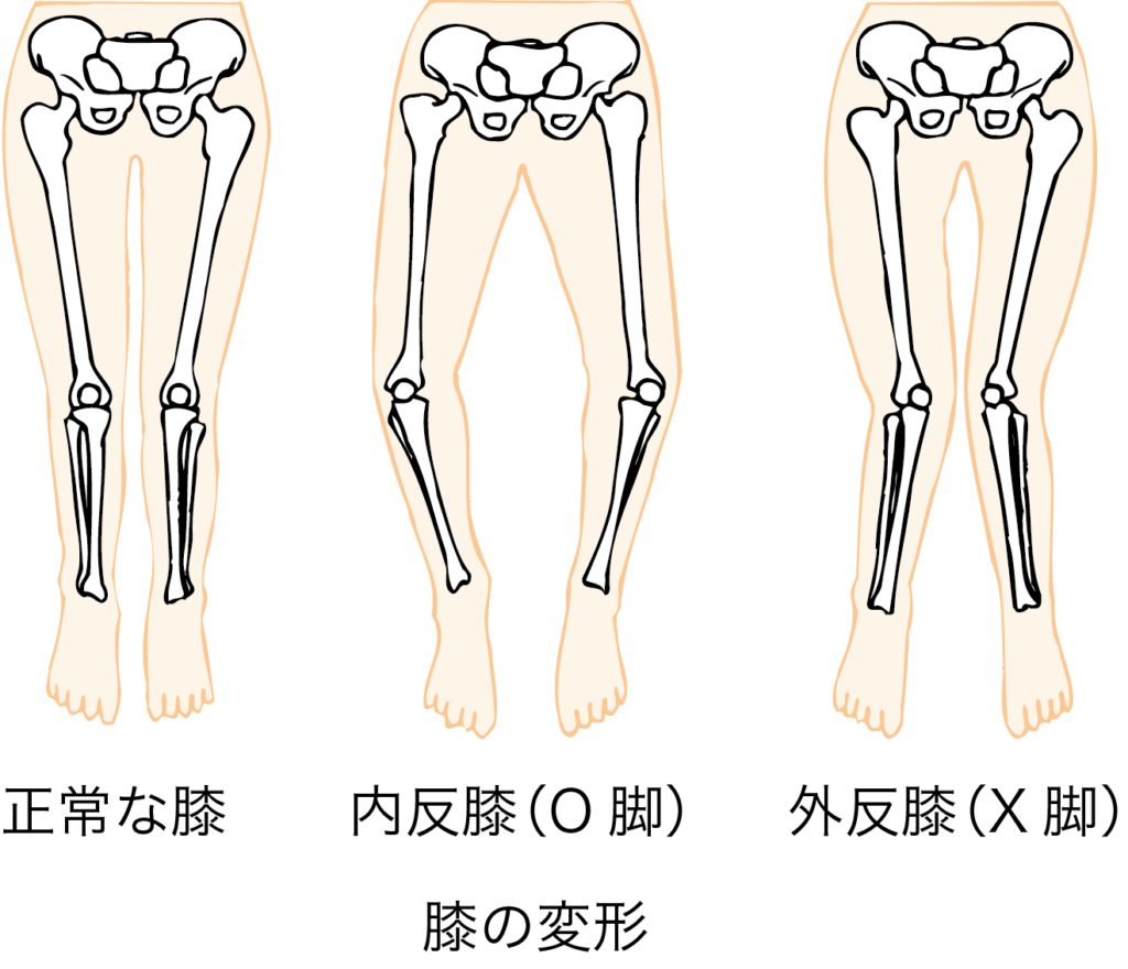 変形性膝関節症ではO脚やX脚、膝の捻じれが生じますが、人工関節によりそれらが解消されます。